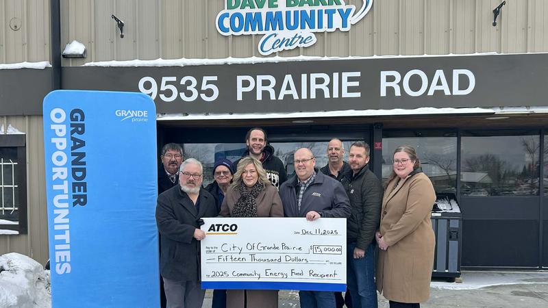 A $15,000 cheque was presented to the City of Grande Prairie Thursday, Dec. 11, to complete an energy audit at the Dave Barr Community Centre.Mayor Jackie Clayton and several members of city council attended the arena to receive the cheque from ATCO.ATCO's Don McNab says Grande Prairie is one of the recipients for ATCO...