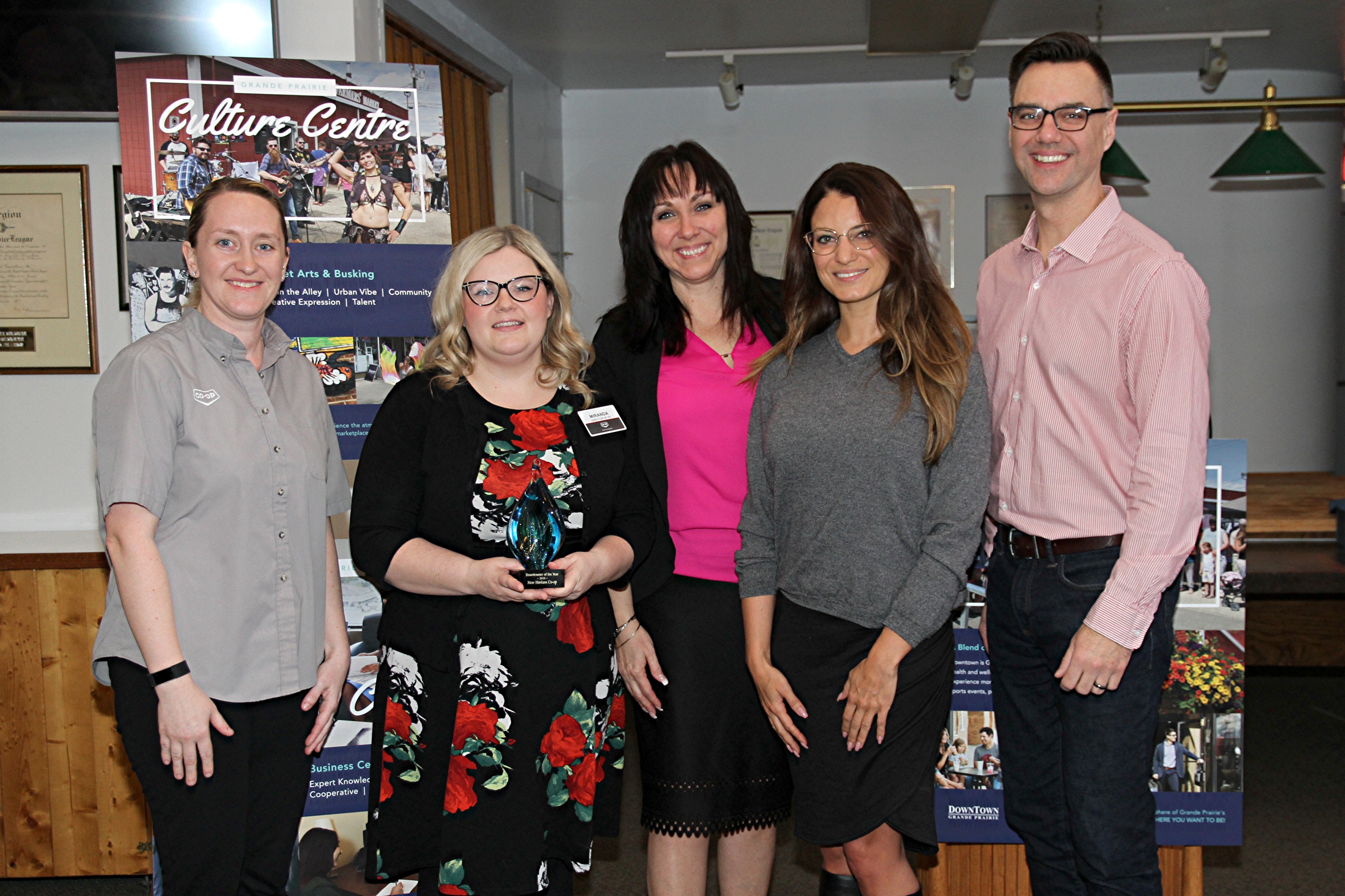 Amanda Bartelds accepted the Art Ouellette Memorial Award on behalf of Telus. Pictured (from left to right): Andre Ouellette, Amanda Bartelds, Wendy Bosch, DTA Chair Chelsea O'Neill and Mayor Bill Given. (Photo courtesy of the Downtown Association)
