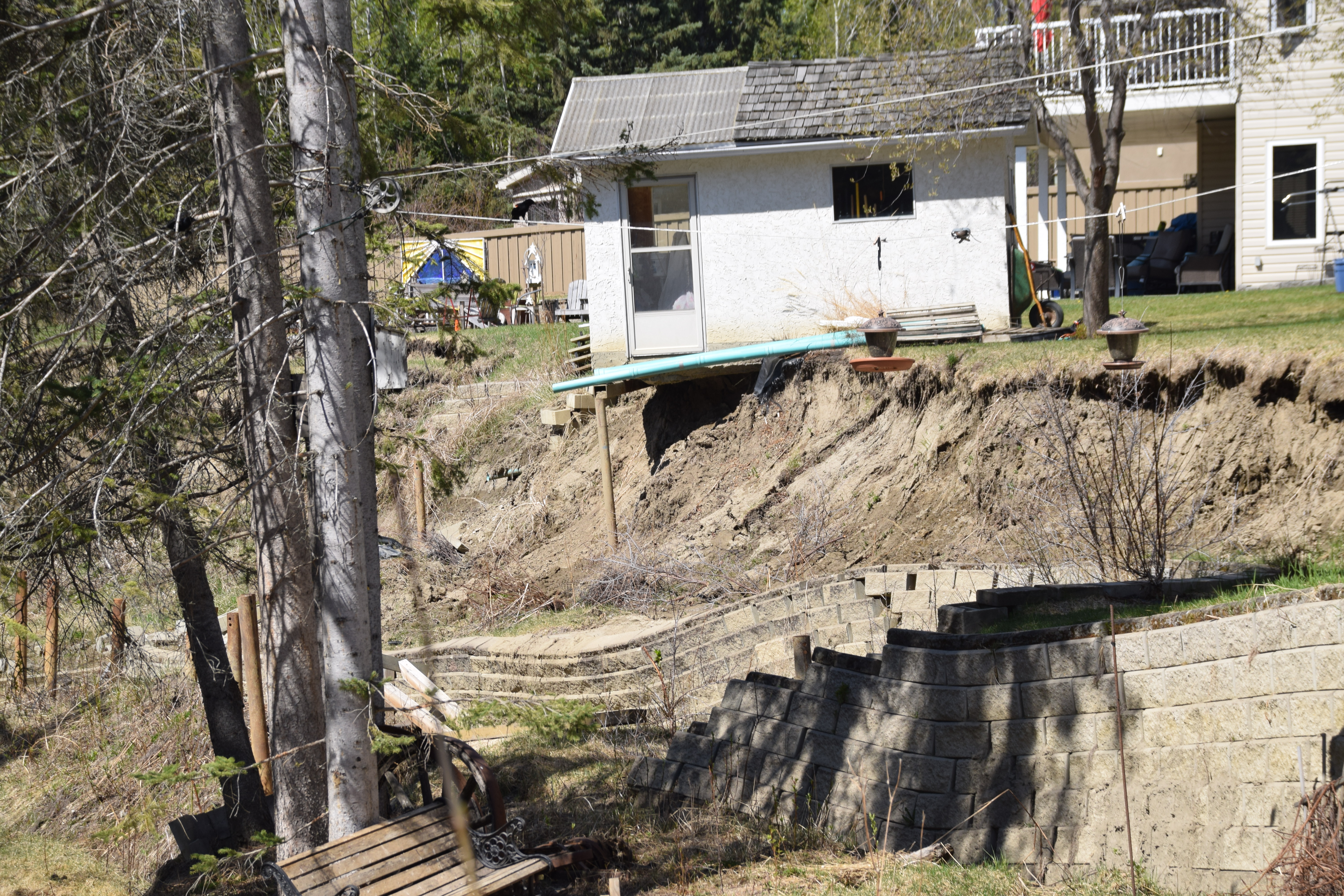 A shed dangles precariously over the edge where the ground has fallen away (photo by Liam Verster)However, the County didn’t come to any concrete conclusion, deciding instead to direct staff to look into the costs associated with the request, as well as the County’s legal obligation in the matter, as this issue is happening on private property, and Bear Creek is the responsibility of the Province.