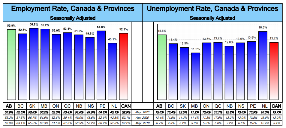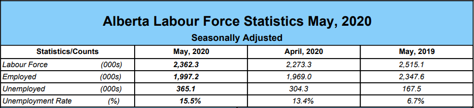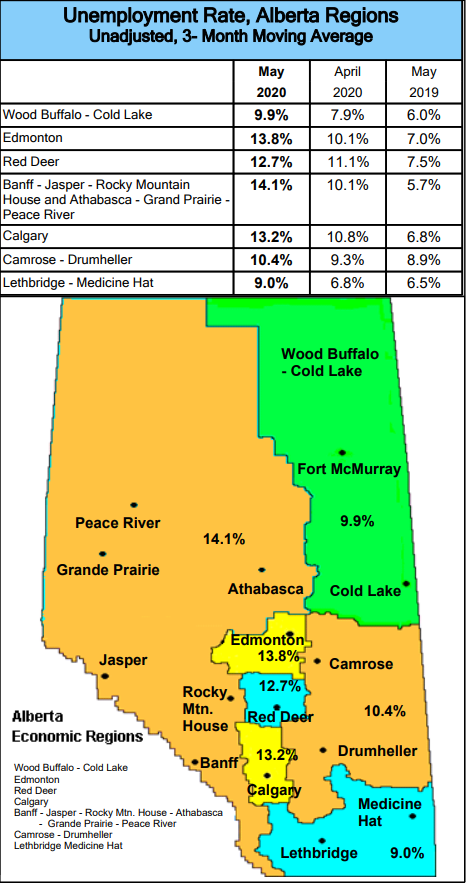 The unadjusted, three month moving average unemployment rate for Banff – Jasper – Rocky Mountain House and Athabasca – Grande Prairie – Peace River increased to 14.1 per cent in May 2020, compared to 10.1 per cent in April 2020. It’s also a significant increase from May 2019, when the unemployment rate was 5.7 per cent.