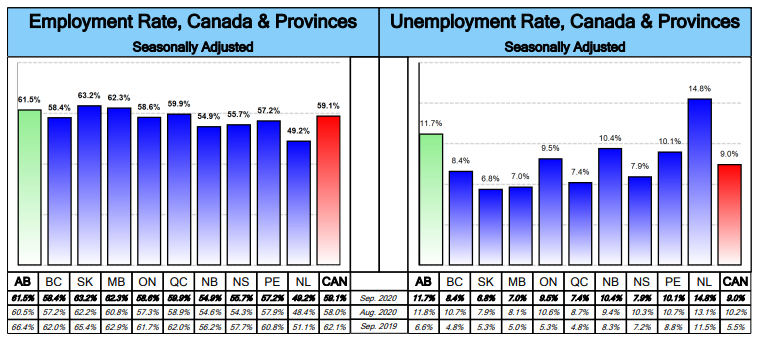 New figures released by Statistics Canada shows that the Banff – Jasper – Rocky Mountain House and Athabasca – Grande Prairie – Peace River economic region recorded an unemployment rate of 11.2 per cent in September 2020, compared to 12.1 per cent in August. However, that figure is still much higher that the 5.9 per cent recorded in September 2019.