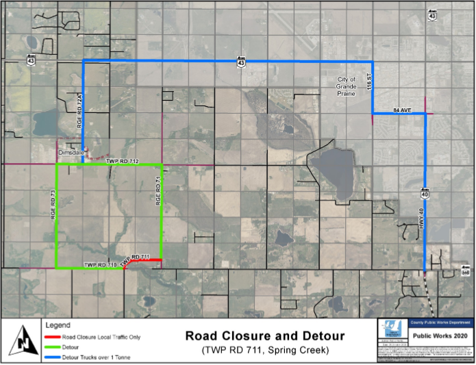 Local traffic is asked to detour using Township Road 712, Range Road 73, Township Road 710, and Range Road 71. Heavy truck traffic over one ton is advised to detour on Range Road 72A and Highway 43.