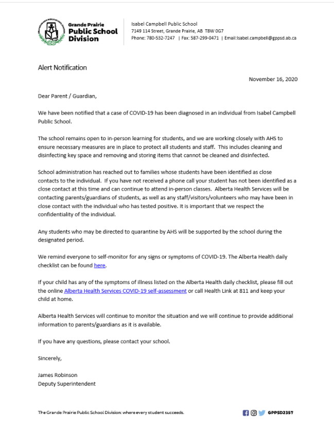The Peace Wapiti Public School Division and Whispering Ridge School wish the individual a safe and speedy recovery. The groups are working with AHS to ensure that the necessary measures are in place to protect all students and staff.