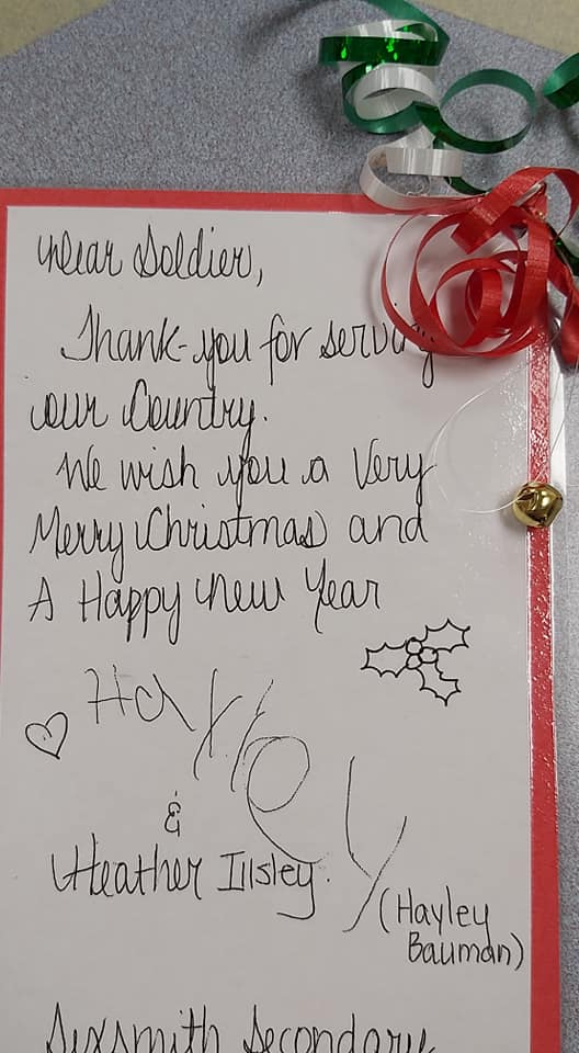 “He (the pastor) had referenced how much letters from home made a difference in the previous wars or even just deployment, and the difference that it made in the morale and encouragement for troops. I thought that was a fantastic idea and I sort of put out a challenge in the community and got a great response last year with over 300 letters.”