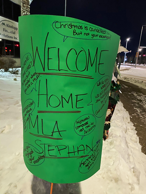 A “Welcome Home” display popped up outside the Red Deer-South MLA’s constituency office Sunday night, a day after it was revealed that he travelled to Arizona despite advisories from both the provincial and federal governments to avoid non-essential travel outside the country over the holidays.