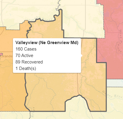 Eleven new cases were recorded in the MD of Greenview along with 13 more recoveries. There are now 87 active cases there, 70 of those are in the Valleyview area.