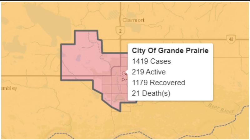 • City of Grande Prairie: 1,419 cases (219 active, 1,179 recovered, 21 deaths)