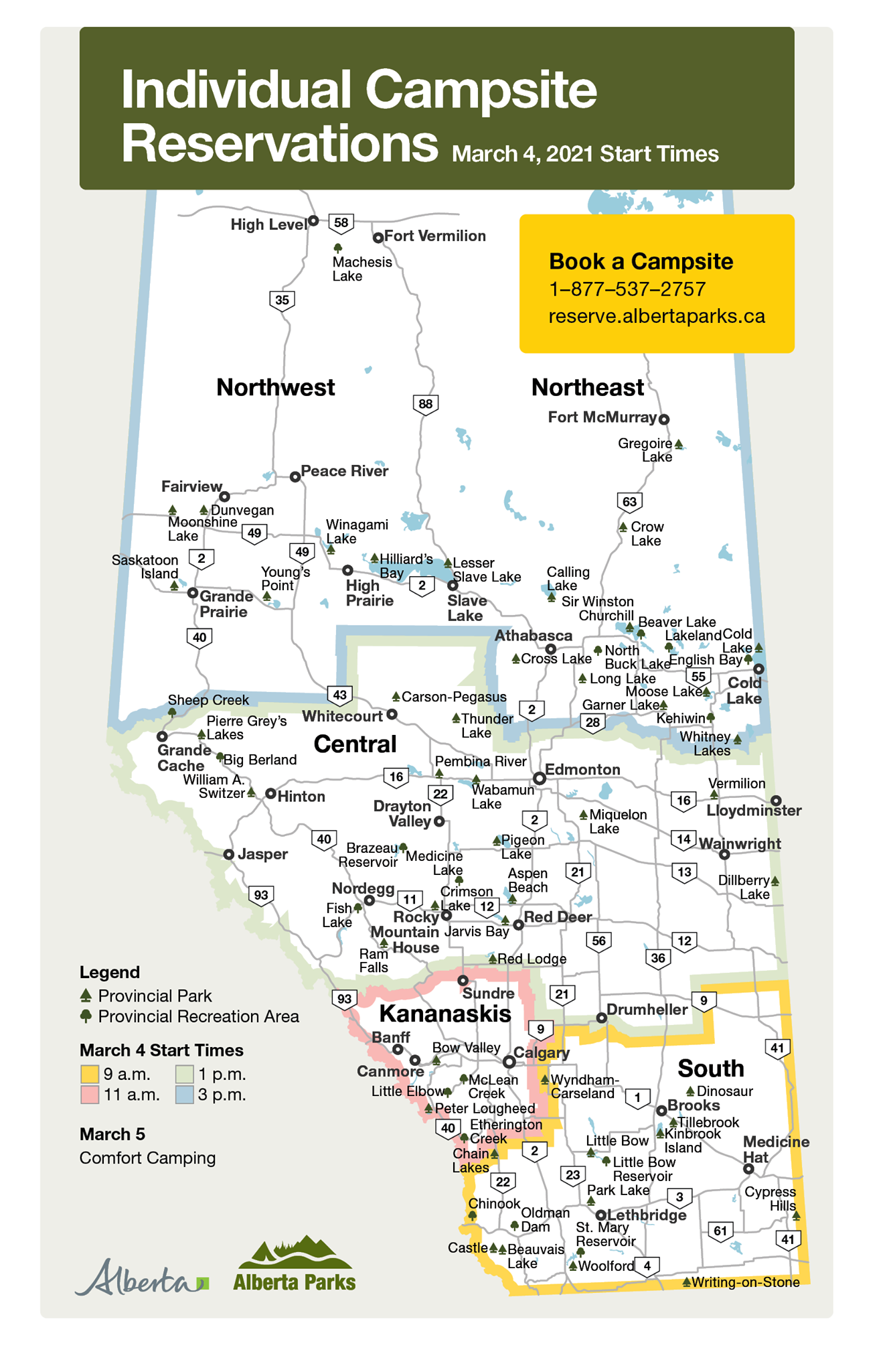 Reservations can be made for up to 90 days in advance of a scheduled arrival date and will be opened up on March 4 at staggered times. Sites in Northern Alberta will be made available starting at 3 p.m. that day.