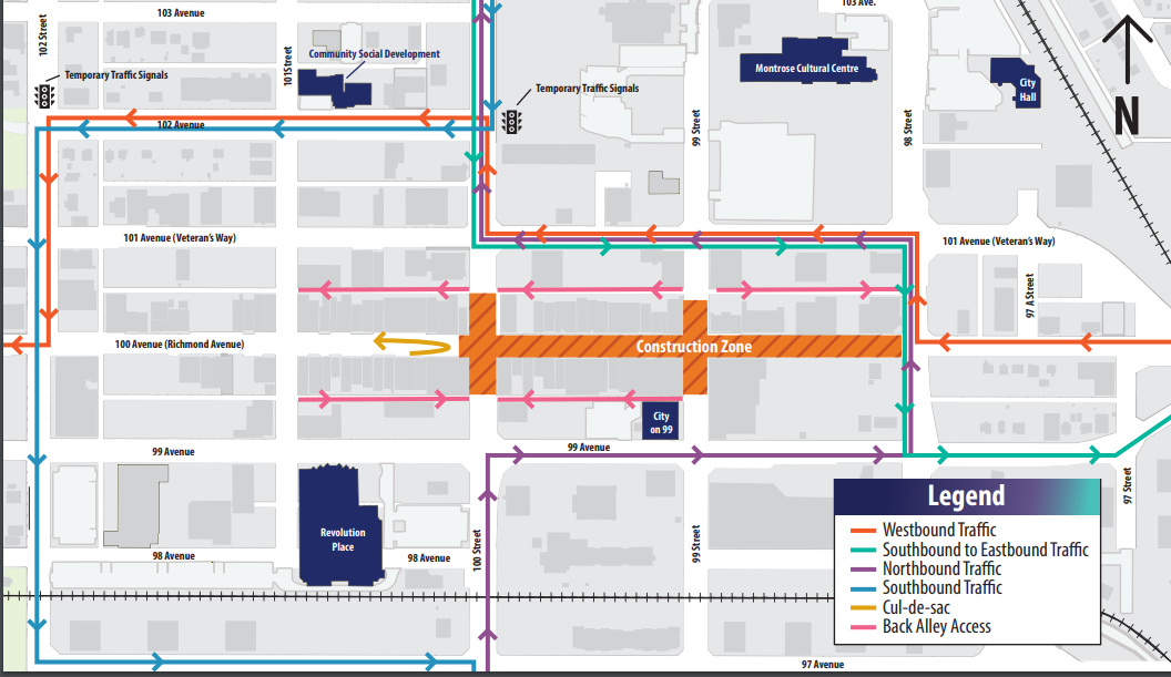 The intersection of 100 Avenue and 100 Street is closing to traffic starting July 1 as work on the Downtown Rehabilitation and Streetscapes Project rolls forward.