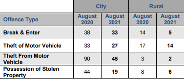 “As far as looking at our stats, break and enters, theft of a motor vehicle, theft from a motor vehicle and possession of stolen property… They’re certainly down from the previous year, in the city and rural.”