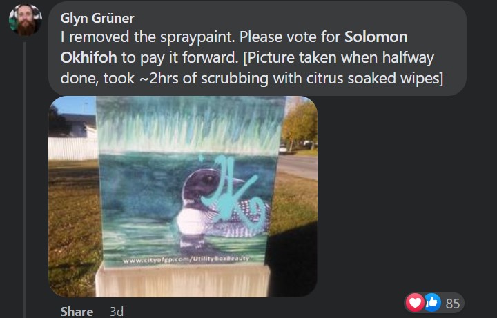 A Facebook post by Hannah’s mother, Jennifer Shkolny was made in a local Grande Prairie forum group showing the vandalism and expressing her disappointment. The post received over 550 reactions.