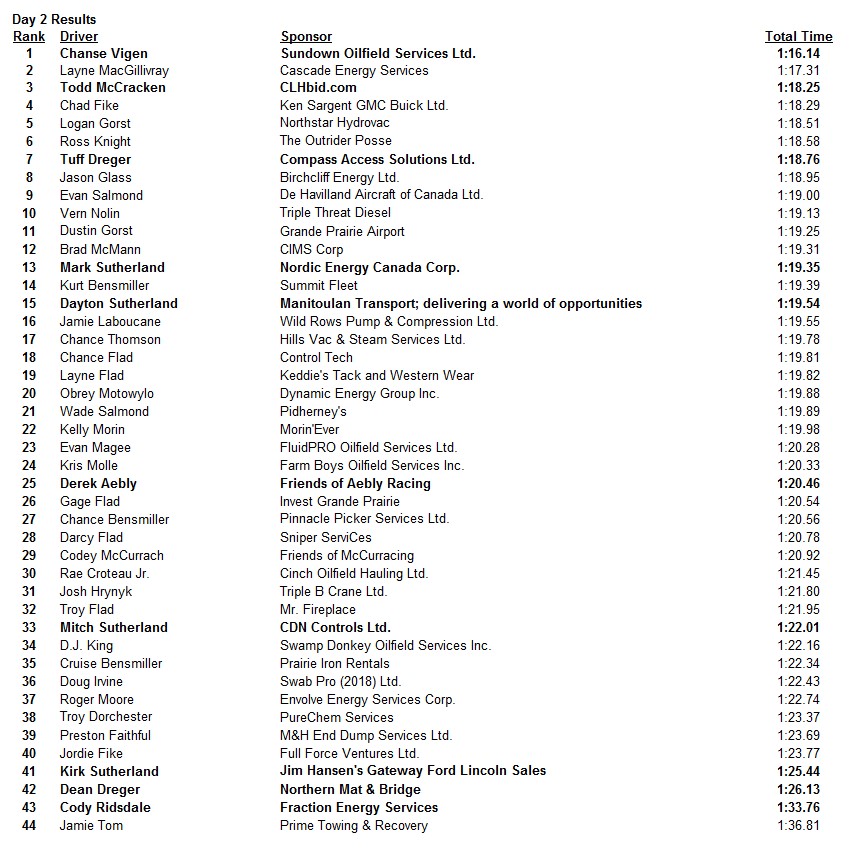 The day money winner on night two of the Grande Prairie Stompede was Chanse Vigen, running penalty free with a time of 1:16.14 driving the Sundown Oilfield Services Ltd. outfit.