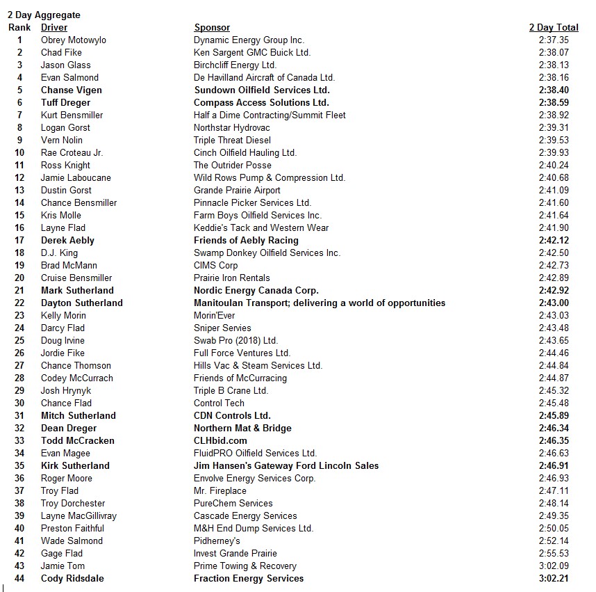 After two runs, Obrey Motowylo still sits first atop the aggregate with a two day combined time of 2:37.35.