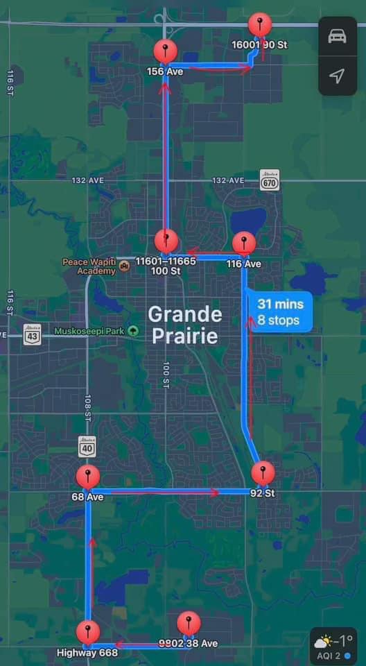 She says after the brightly decorated trucks are done driving the route (see photo attached below), the festivities will continue at the Harold’s Towing yard with the fundraiser and donation drive for Helping Hands Society of Grande Prairie.