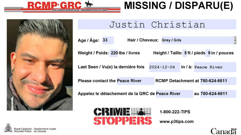 Thirty-three-year-old Justin Jesse Christian was last seen in the “early hours” of December 4 in Peace River, and there is now a concern for his wellbeing.