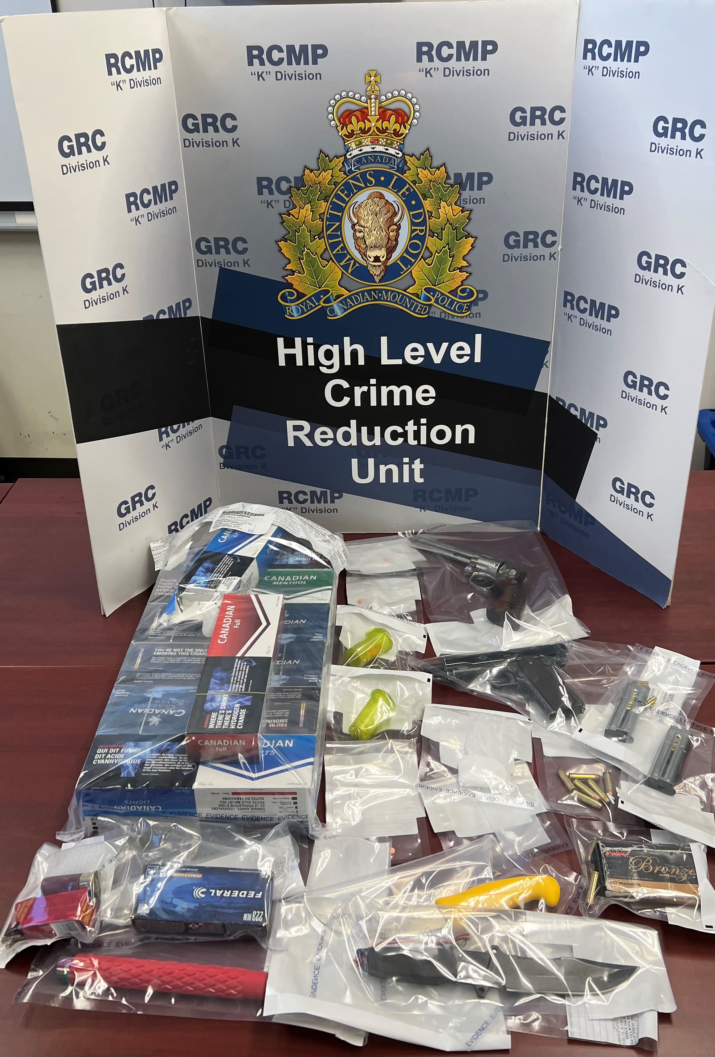 At approximately 8:00 p.m. the RCMP and Crime Reduction United responded to the call, arrested three males and two females seized two firearms, approximately 50 grams of suspected cocaine and approximately 2800 unstamped cigarettes.