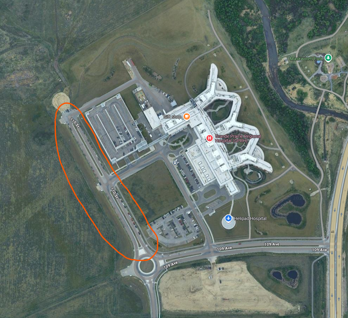 The stretch of road that runs alongside the Grande Prairie Regional Hospital parkade is commonly used as free parking for hospital visitors.