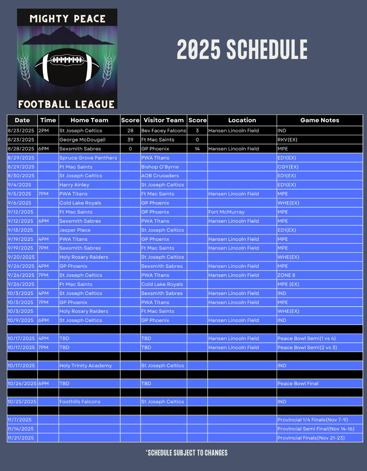 The first Mighty Peace Football game of the year between the GP Comp. and Sexsmith Sabres was cut short on Thursday, Aug. 28.