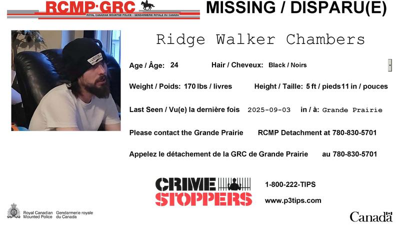 The Grande Prairie RCMP is seeking the public’s assistance with locating 29-year-old Ridge Chambers.