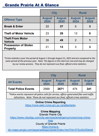 The Grande Prairie RCMP detachment has released its rough crime statistics for August 2025.