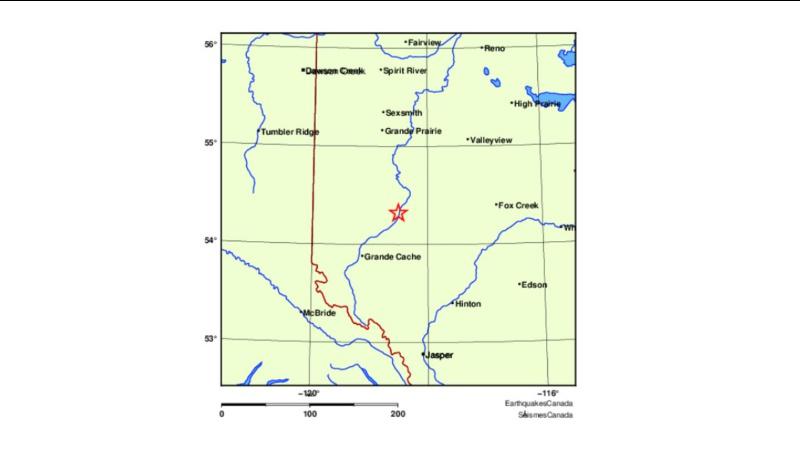 Earthquakes Canada reports a 4.4 magnitude earthquake happened at approximately 12:50 p.m., 63 km northeast of Grande Cache.