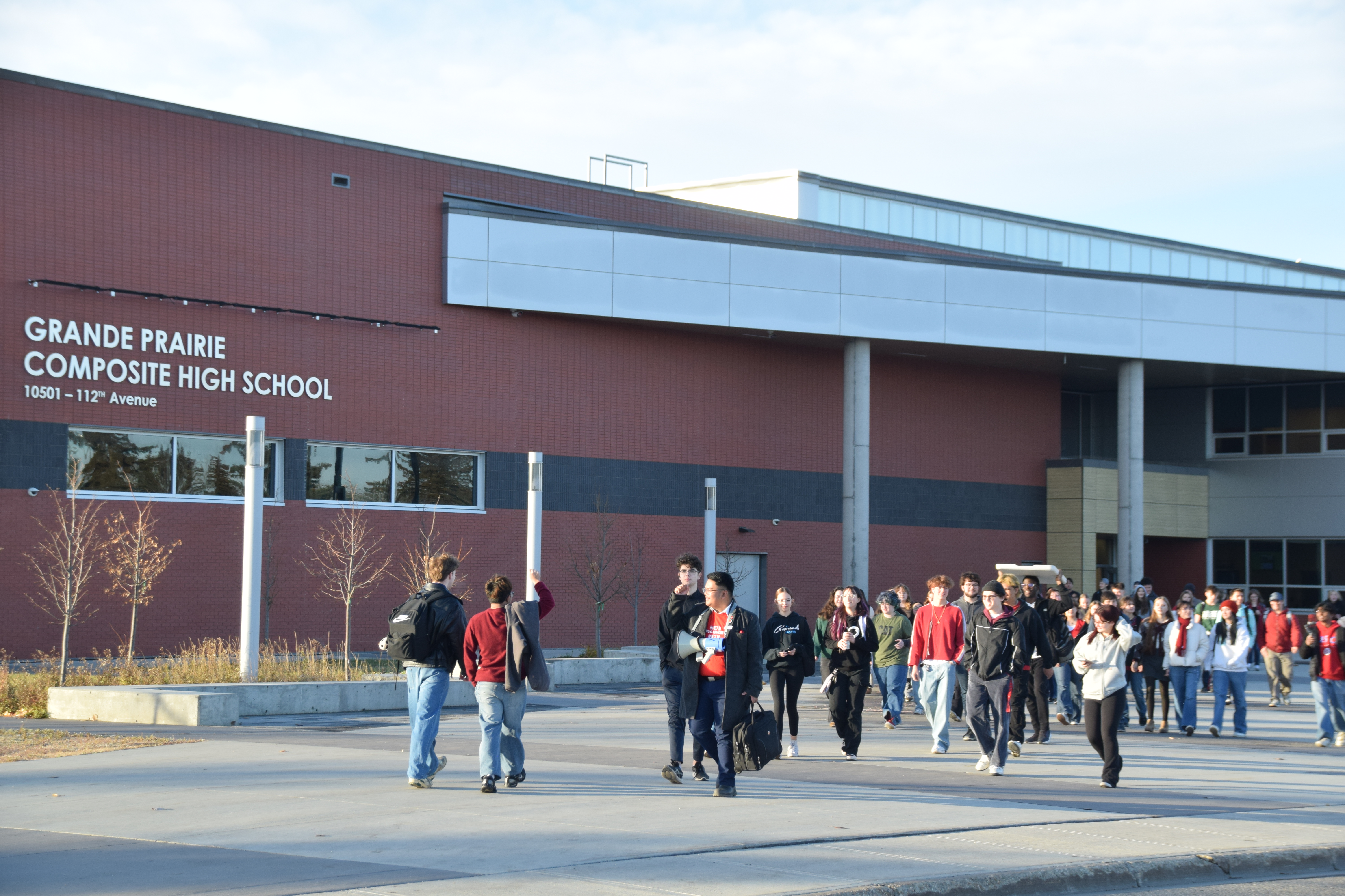 Nearly 100 to 150 students joined the movement on Thursday, Oct. 30 to walk out of class and peacefully protest for their teachers who can’t at the Grande Prairie Composite High School.