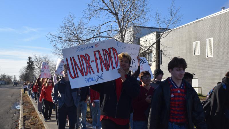 The group of students bearing handmade signs walked around Muskoseepi Park area and returned to the student parking lot to vent their frustrations with the education system in the province and to voice their support for educators.