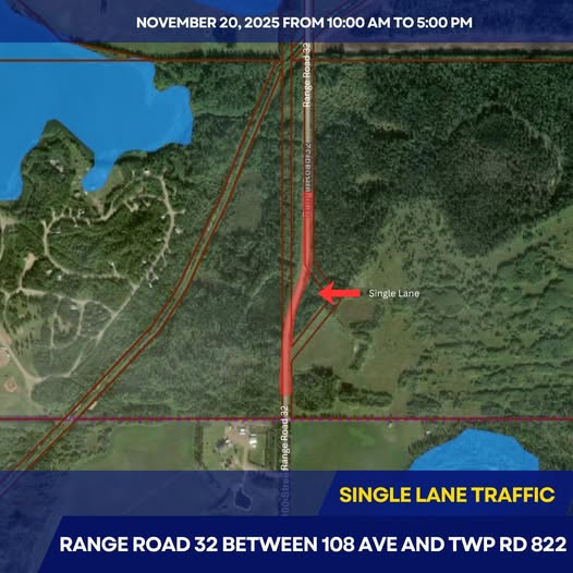 The road will be single lane between 108 Avenue and Township Road 822 from 10:00 a.m. to 5:00 p.m.