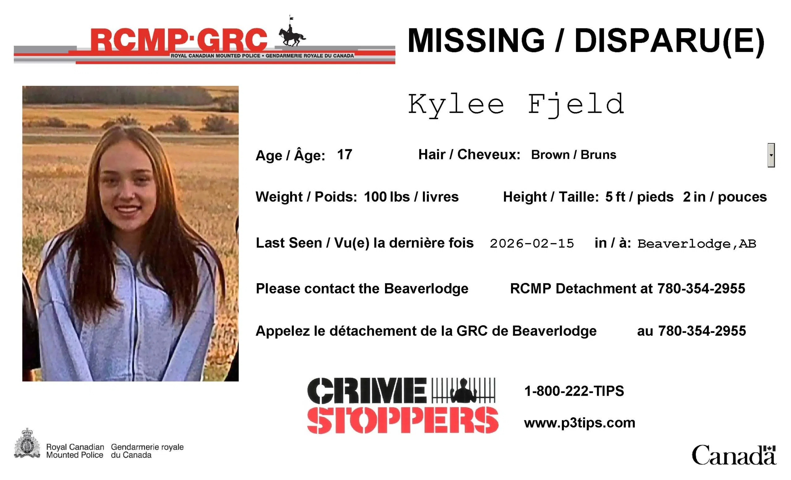 UPDATE: Bearveerlodge RCMP have located Kylee Fjeld safe, and thank the public for their assistance.