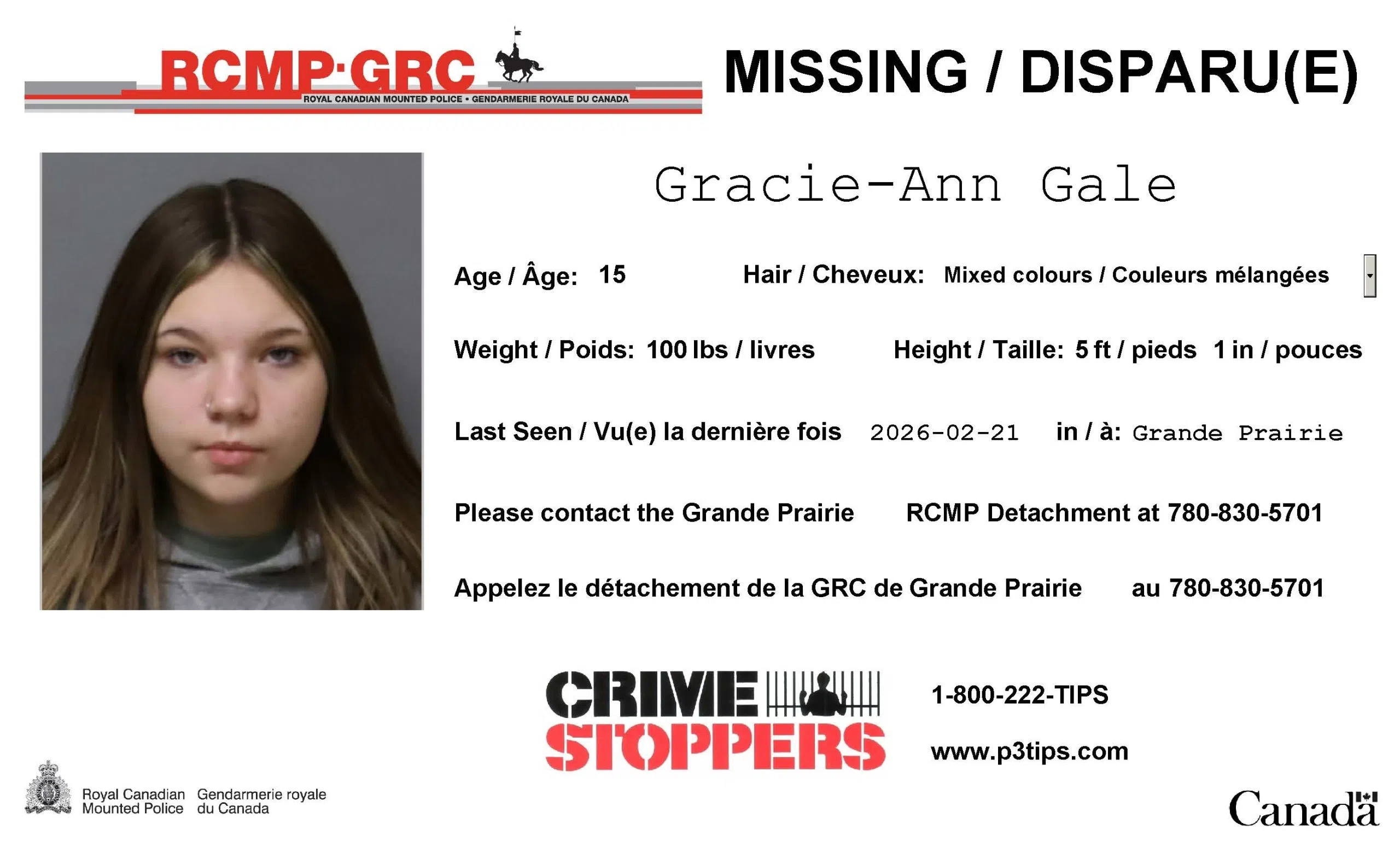 Anyone with information on Gale’s whereabouts is asked to contact the Grande Prairie RCMP detachment at 780-830-5700, or Crime Stoppers at 1-800-222-8477 (TIPS).