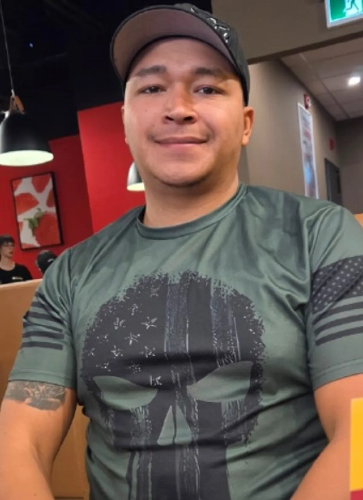 • Has a half sleeve tattoo of a skull on his left arm; and