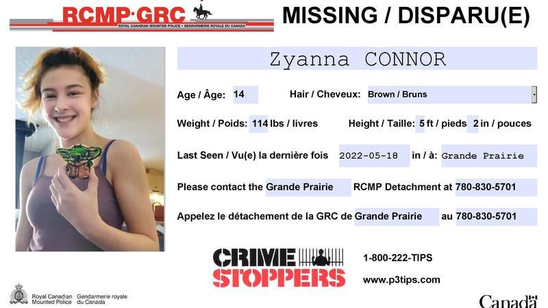 Update on Thursday, May 19, 2022 - Grande Prairie RCMP wish to thank the media and community in their support to finding Zyanna. Zyanna Connor was located safe and returned to her home.Grande Prairie ...