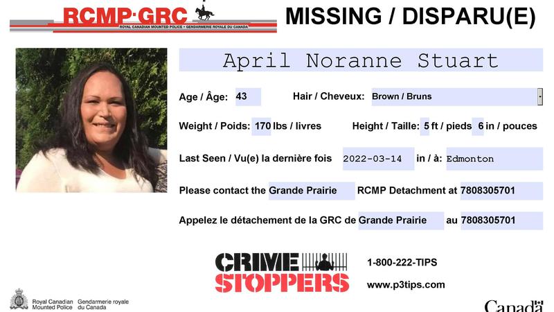 Grande Prairie RCMP are looking for a missing 43-year-old woman.Police say the family of April Stuart told them that she has not been heard from since March of 2022 and there is concern for her well-b...