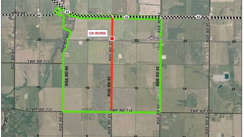 The County of Grande Prairie says that CN Rail will close Range Road 93 between Highway 43 and Township Road 712 to repair damaged track at the railway crossing Thursday. The closure will begin at 9 a...