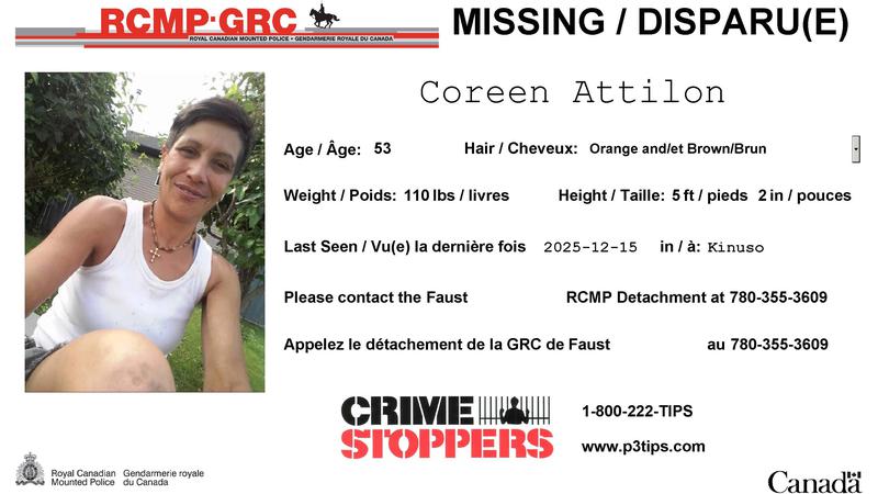 UPDATE:Mounties are letting the public know that Coreen Annette Attilon was safely located.Faust RCMP are concerned for the well-being of a missing woman, and are asking for the public's help.Slave La...