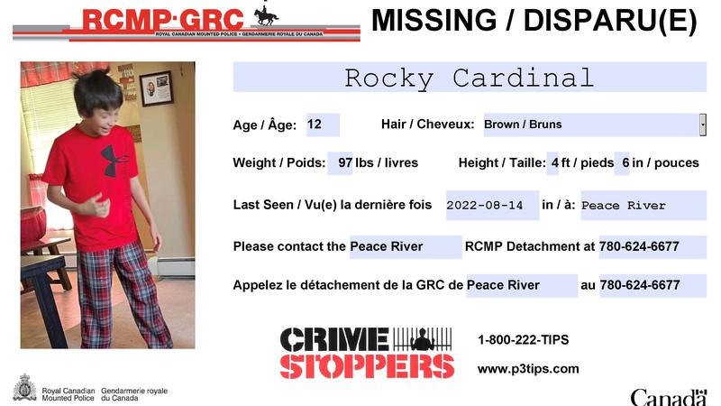 Update: Peace Regional RCMP say they are happy to report that 12-year-old Rocky Cardinal. Mounties would like to thank the public for their assistance.The Peace Regional RCMP is asking for the public ...