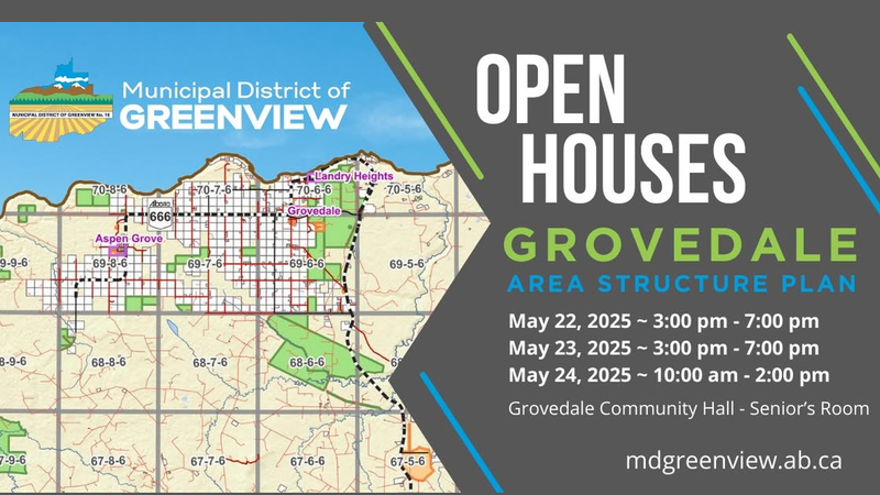 The Municipal District of Greenview is hosting a series of open houses this week to gather input on the Grovedale Area Structure Plan.Attendees will be able to discuss proposed changes and provide inp...