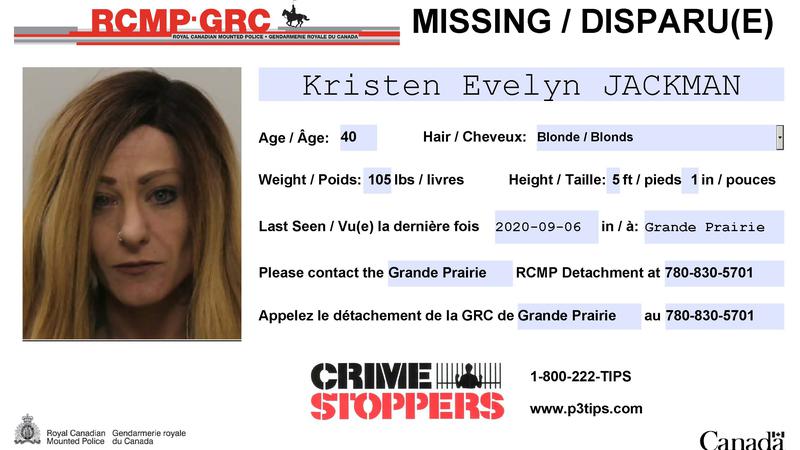 The Grande Prairie RCMP is asking the public for assistance in locating 40-year-old Kristen Jackman, who was last seen in the Grande Prairie area on Sunday, September 6.She is described as 5'1" tall, ...