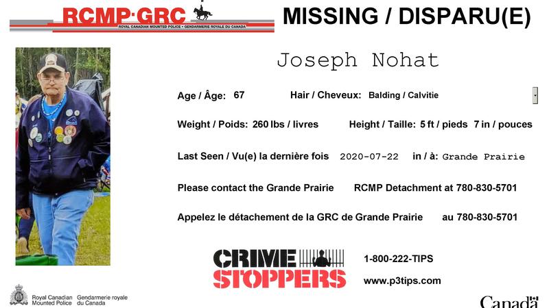 Grande Prairie RCMP are seeking the public's assistance in locating 67-year-old Joseph Nohat, who was last seen in the Royal Oaks area of Grande Prairie on July 22. Joseph is described as: 5'7"260 lbs...