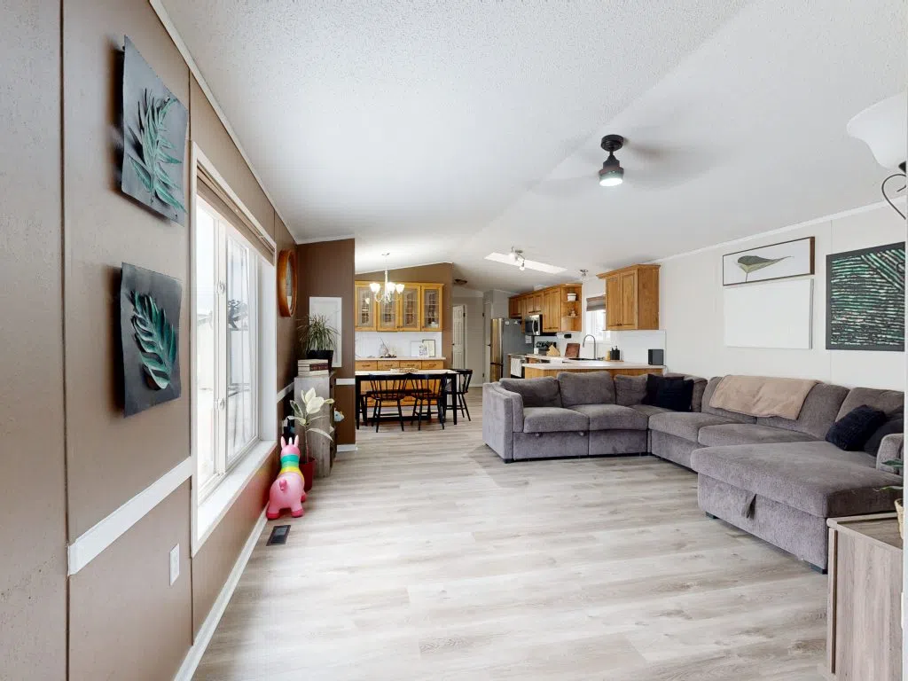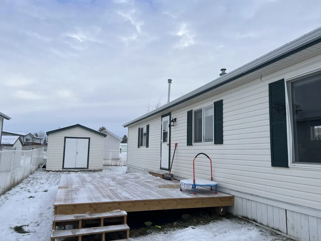Welcome to easy, comfortable living in the desirable ‘Silver Pointe’ community, just a few minutes from the City of Grande Prairie! This well-maintained & clean manufactured home is the perfect blend of affordability & space, in a quiet neighborhood setting. Step inside to a bright, open-concept floor plan, enhanced by vaulted ceilings, that is ideal for both entertaining and everyday family life. The main living area with gorgeous & new vinyl plank flooring, flows seamlessly into the dining space and a well-appointed kitchen featuring ample cabinetry & counter space, skylight and all new stainless steel appliances. Enjoy privacy with the spacious primary suite, situated at the opposite end of the home of the other 2 bedrooms & the main bathroom. This retreat boasts a convenient walk-in closet and 4-piece ensuite bathroom. The home also includes a separate laundry area/mudroom with an additional exterior entrance. The appeal extends outside to the brand new deck, eavestroughs and stairs. For extra storage, there is a handy shed included for tools, tires or your recreational gear. Inside also has a host of new updates: kitchen sink, faucet & backsplash, hot water tank, and interior doors & hardware. Silver Pointe Village residents will enjoy the community’s miles of paved walking trails, water features, stocked trout pond, playground, baseball diamond, and skating rink with a zamboni! Ideal location with access to a large variety of activities and attractions, including a 5 minute drive to Costco and all the awesome west end businesses in Grande Prairie. Pad rent fees includes water, sewer, garbage pickup, and maintenance of common areas. Contact a REALTOR® today for more information or to view!